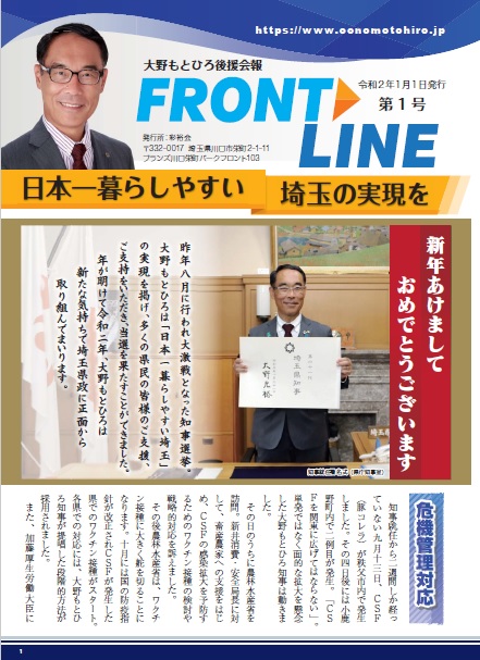 INFORMATION お知らせ メディア掲載 活動報告 2020年01月06日 お知らせ 大野もとひろ後援会報「FRONT LINE」第1号 明けましておめでとうございます。 埼玉県知事大野もとひろは、新たな気持ちで、埼玉県政に正面から取り組んでまいります。 本年もよろしくお願いいたします。 大野もとひろ後援会報「FRONT LINE」第1号を発行いたしました。 全4ページ(PDF 1.49MB) 2023年12月19日 お知らせ 県内FM13局合同 知事インタビュー放送予定日をご案内致します。 2023年12月11日 お知らせ 県内FM13局による知事合同インタビューの放送日が決まりました。 2023年11月02日 お知らせ FM NACK5の新しいラジオ番組「大野もとひろ SAITAMA+(プラス)」の放 送が11月5日(日曜日)から始まります。 2023年08月12日 お知らせ 事務所移転のお知らせ 2023年08月01日 お知らせ 埼玉県知事選挙8月3日の大野もとひろの活動予定です。 PAGE TOP